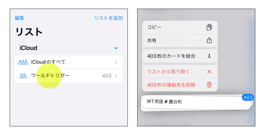 インポートデータはすべて連絡先アプリの「ワールドトリガー」というグループに入るようになっているので、そこから不要なものを削除してください。