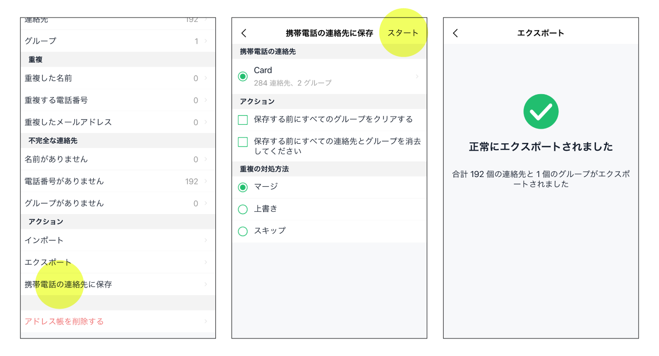 携帯電話の連絡先に保存→画像のような設定になっていることを確認しスタート